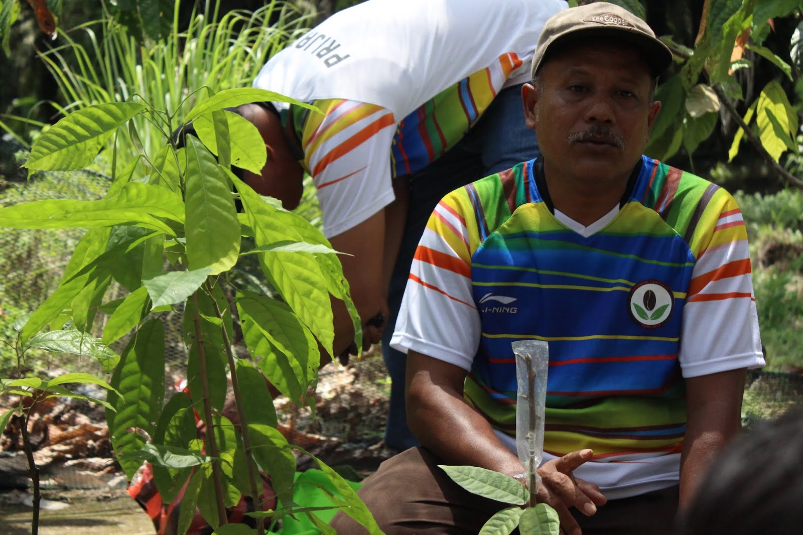 Setelah selesai di kebun coklat, kelompok kami bertukar tempat. Kami pergi ke bagian pembibitan dan pencangkokan. Untuk bibit coklat ini, para kelompok tani mendapat bibit yang berasal dari Aceh. Mereka mendapatkannya sewaktu mengikuti kegiatan (kalau tidak salah) Konferensi Kakao (jika salah, mohon dikoreksi).