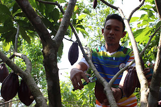 Coklat yang biasa kita konsumsi itu adalah biji dari buah coklat ini. Bijinya itu dibersihkan, dikeringkan, lalu diolah sehingga menjadi coklat yang siap dikonsumsi. Di kebun milik kelompok tani ini belum memiliki alat untuk mengolah biji coklat.
