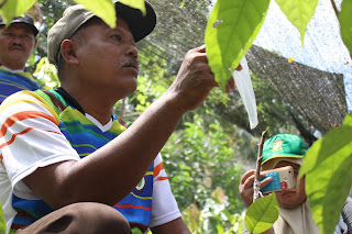 Setelah selesai di kebun coklat, kelompok kami bertukar tempat. Kami pergi ke bagian pembibitan dan pencangkokan. Untuk bibit coklat ini, para kelompok tani mendapat bibit yang berasal dari Aceh. Mereka mendapatkannya sewaktu mengikuti kegiatan (kalau tidak salah) Konferensi Kakao (jika salah, mohon dikoreksi).